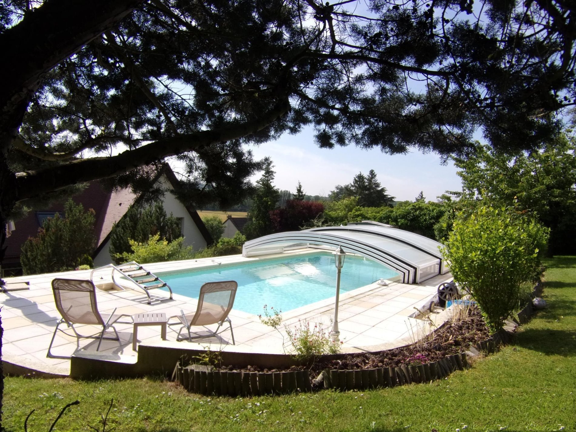 Maison d'architecte lumineuse de 228 m² offrant vaste séjour avec cheminée centrale à insert, cuisine équipée, une suite parentale avec un grand dressing (ancien bureau) au rez de chaussée. A l'étage grande pièce palière , 4 chambres, salle d'eau, En rez de jardin, garage double,bureau, salle de sport une buanderie et véranda. Terrain clos et arboré de 2080m² avec piscine. combles aménageables. Chauffage par pompe à chaleur. 3mn gare de Maintenon. transports scolaires.